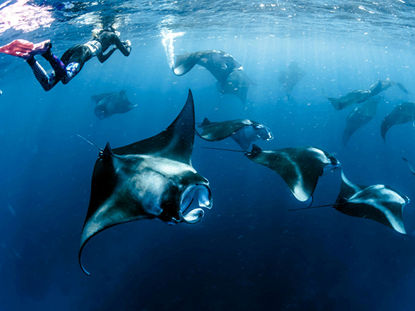 Az itt élő ördögráják (vagy más néven manta ráják) az Atlanti-óceánban élő rokonaiknál kisebbek ugyan, a két-három – sőt olykor akár öt – méteres szárnyfesztávukkal csapatokban úszó különleges halak így is igazi óriásoknak tűnnek. A manták lassú vízalatti repülését és a cetcápák nyugodt lebegését közelről megfigyelni hatalmas élmény, az óriások közelsége lenyűgöző, békéjük mélyen megnyugtató. Aki ezt egyszer is személyesen megtapasztalhatja, rövid időre kilép a valóságból és közben egy fenséges titok részévé válik.